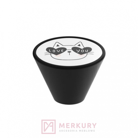 Gałka meblowa drewniana czarna GD09 stożkowa, kot z napisem love V99