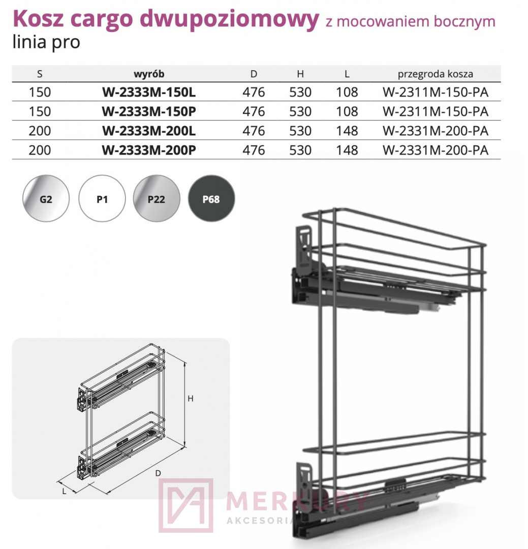 Kosz Cargo mini 2-poziomowy W-2333M, srebrny, montaż boczny prawy, 150mm