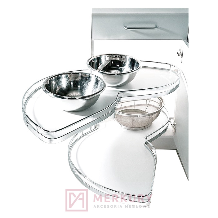 Półka LeMans 05.706.KPL/B to świetne rozwiązanie, które pozwoli Ci wykorzystać trudną dostępną przestrzeń szafek narożnych. Nerka posiada dwie, niezależnie wysuwające się półki, których maksymalne obciążenie wynosi po 25kg. Każda z nich posiada antypoślizgowe pełne dno oraz reling, które zabezpieczają produkty przez nagłym przemieszczaniem. Wygodnemu użytkowaniu kosza narożnego sprzyja również pełen wysuw elementu, który zwiększa dostęp do zawartości od góry.