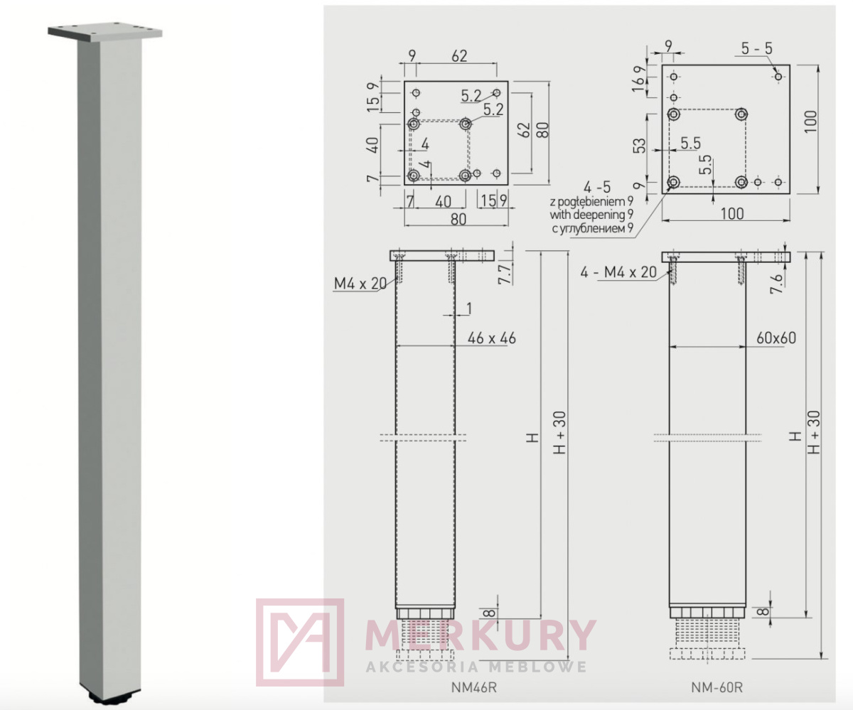 Noga stołowa kwadratowa 60x60, regulowana, aluminium mat, H-710mm