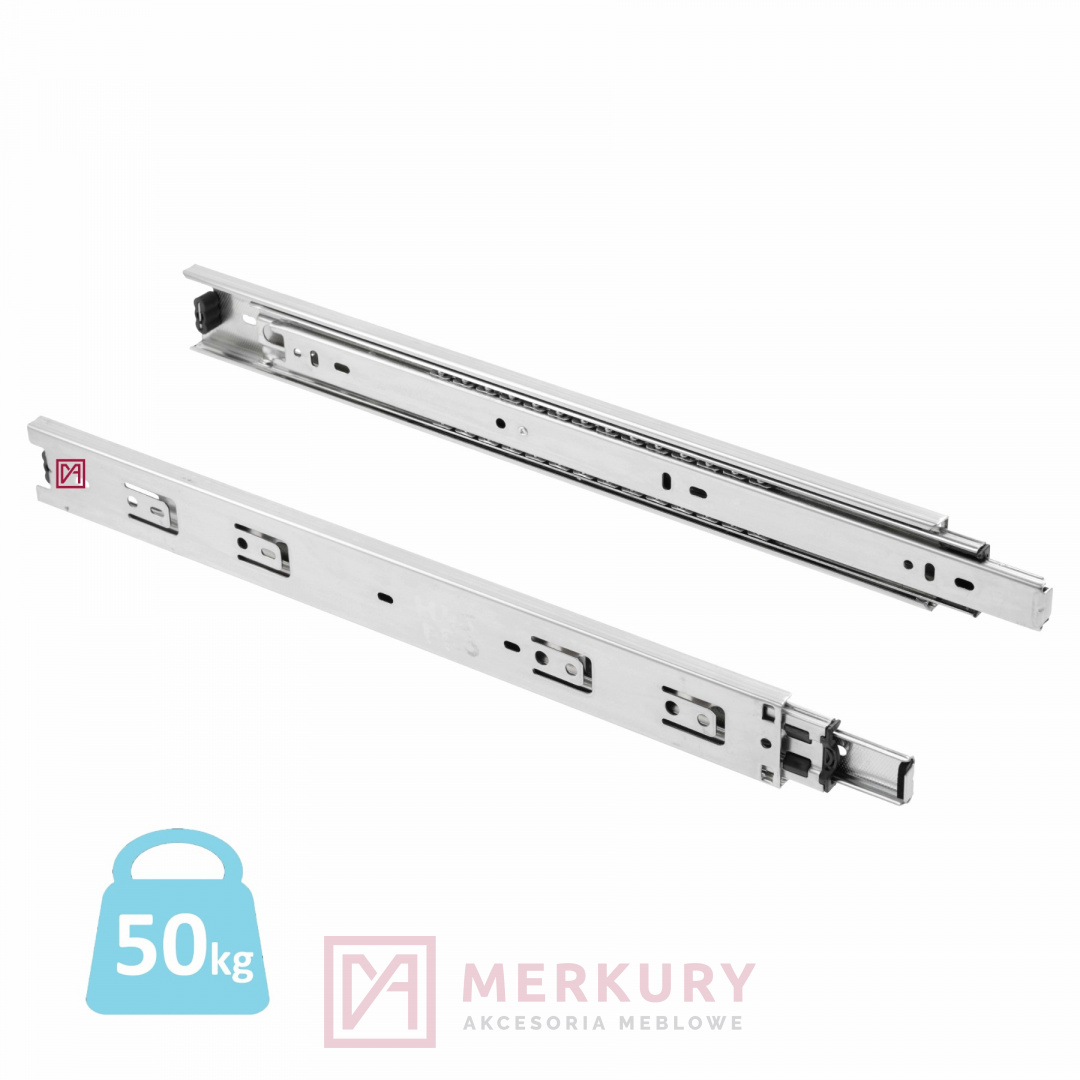 Uniwersalna prowadnica kulkowa sprawdzi się w wielu typach mebli, zarówno kuchennych, łazienkowych, sypialnianych, a także garderobianych. Dzięki wykorzystaniu materiału o wysokiej jakości i niezwykłej trwałości to niezbędny element dla szuflad z dużym obciążeniem. Jej ogromny udźwig - aż 50 kilogramów! utrzyma nawet niektóre produkty AGD, ciężkie słoiki z przetworami czy sprzęt warsztatowy. Pełny wysuw prowadnicy gwarantuje łatwy dostęp do głębiej schowanych rzeczy, a solidna budowa zapewnia długie i przyjemne użytkowanie.