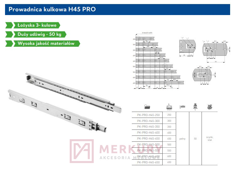 • Prowadnica kulkowa H45 PRO, 300mm, udźwig 50kg