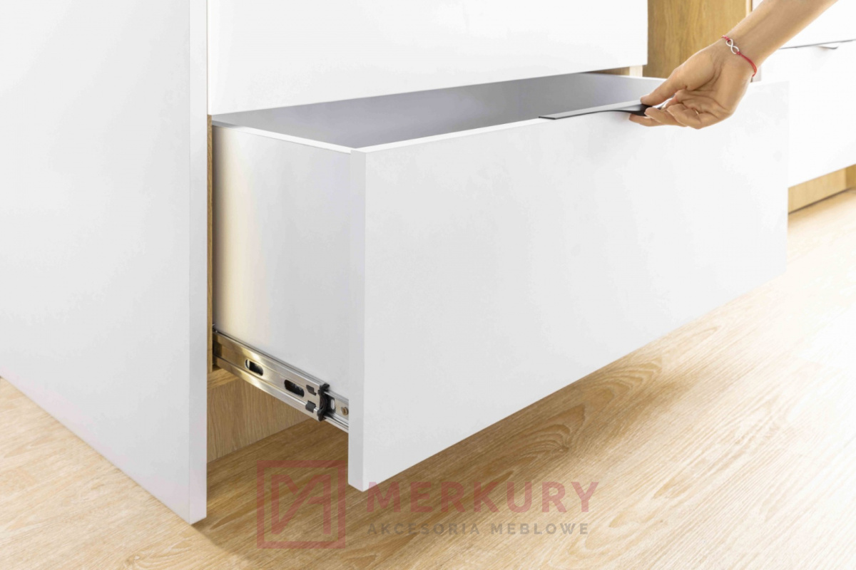 Uniwersalna prowadnica kulkowa sprawdzi się w wielu typach mebli, zarówno kuchennych, łazienkowych, sypialnianych, a także garderobianych. Dzięki wykorzystaniu materiału o wysokiej jakości i niezwykłej trwałości to niezbędny element dla szuflad z dużym obciążeniem. Jej ogromny udźwig - aż 50 kilogramów! utrzyma nawet niektóre produkty AGD, ciężkie słoiki z przetworami czy sprzęt warsztatowy. Pełny wysuw prowadnicy gwarantuje łatwy dostęp do głębiej schowanych rzeczy, a solidna budowa zapewnia długie i przyjemne użytkowanie.