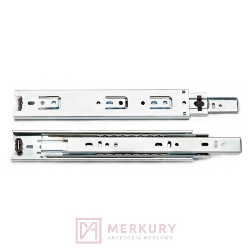 Prowadnice kulkowe zapewniają pełny lub niemal pełny wysuw szuflady, co znacząco ułatwia dostęp do jej zawartości – nawet w wąskich i płytkich meblach. Mechanizm oparty na hartowanych stalowych kulkach gwarantuje płynną i stabilną pracę oraz wysoką trwałość. Dodatkowym atutem jest możliwość szybkiego demontażu szuflady, co ułatwia montaż, regulację i późniejszą konserwację.
