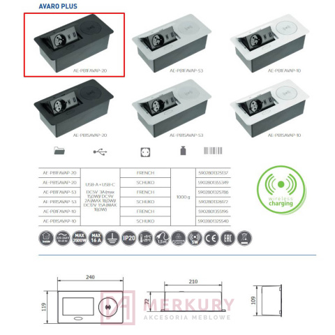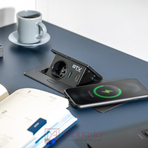 Przedłużacz biurkowy wpuszczany AVARO PLUS, 1 G, USB A C, ład. indukcyjna, czarny