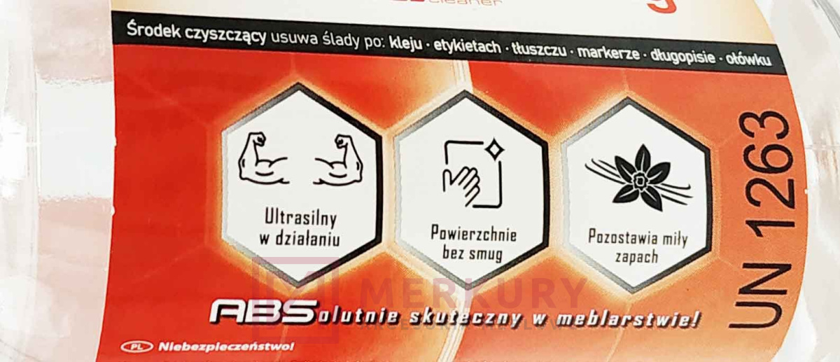 Absorfen Strong ABS Cleaner - bardzo mocny środek czyszczący z antystatykiem nie rozpuszczający tworzywa stosowany do czyszczenia powierzchni płyt meblowych zakońoczonych obrzeżem meblowym ABS, usuwania resztek kleju zostawionych podczas oklejania płyt meblowych, czyszczenia twardych płyt kompaktowych PVC, profili powlekanych folią (system Renolit) i profili poliuretanowych, Płyt z twardego spienionego PVC np. Forex®. Absorfen Strong ABS Cleaner - przeznaczony szczególnie do usuwania kurzu, resztek kleju z folii ochronnych, śladów tłuszczu, gumy, resztek świeżej pianki poliuretanowej i świeżej pozostałości masy uszczelniającej jak również czyszczenia z resztek bitumu i smoły, śladów po olówku stolarskim czy markerze.