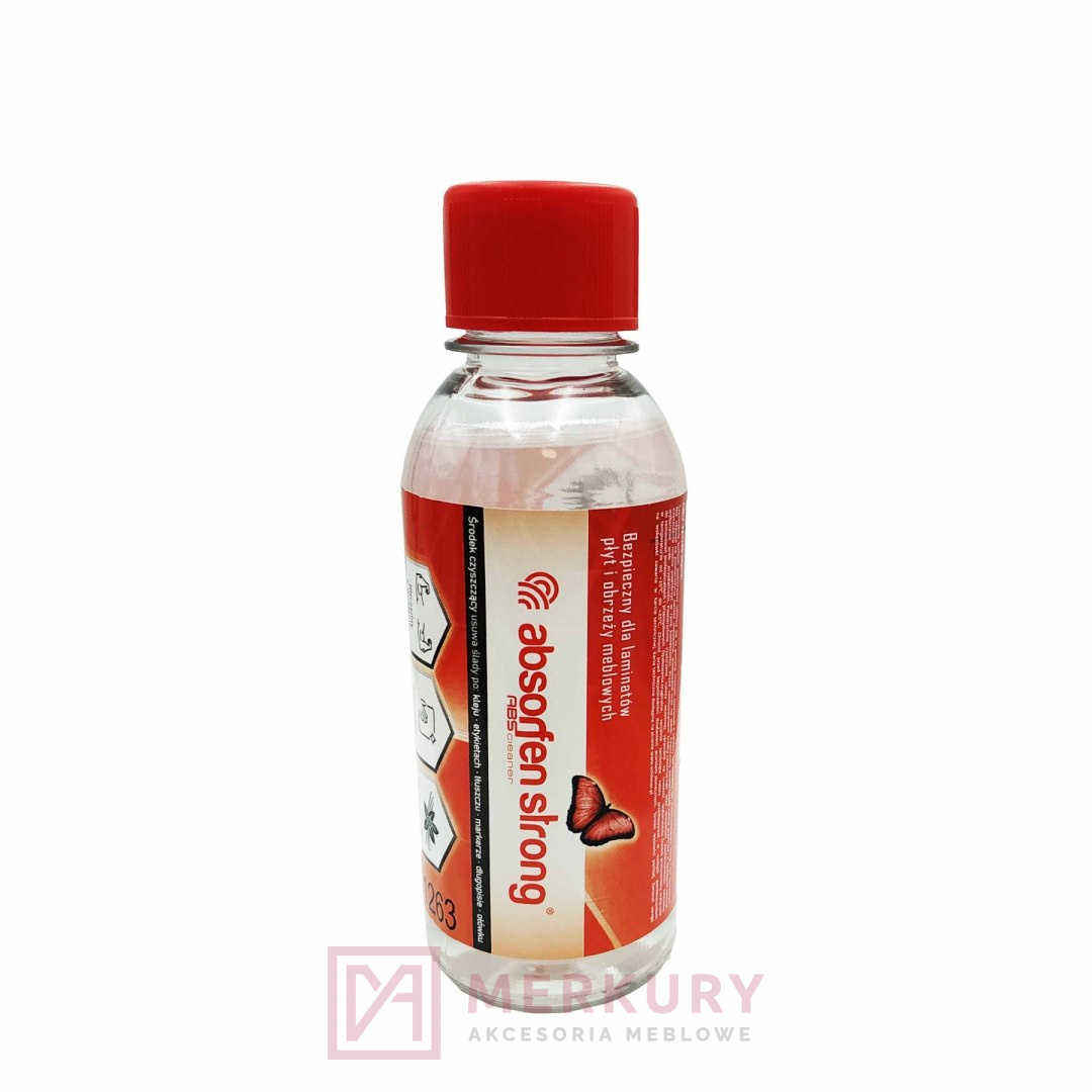 Absorfen Strong ABS Cleaner - bardzo mocny środek czyszczący z antystatykiem nie rozpuszczający tworzywa stosowany do czyszczenia powierzchni płyt meblowych zakońoczonych obrzeżem meblowym ABS, usuwania resztek kleju zostawionych podczas oklejania płyt meblowych, czyszczenia twardych płyt kompaktowych PVC, profili powlekanych folią (system Renolit) i profili poliuretanowych, Płyt z twardego spienionego PVC np. Forex®. Absorfen Strong ABS Cleaner - przeznaczony szczególnie do usuwania kurzu, resztek kleju z folii ochronnych, śladów tłuszczu, gumy, resztek świeżej pianki poliuretanowej i świeżej pozostałości masy uszczelniającej jak również czyszczenia z resztek bitumu i smoły, śladów po olówku stolarskim czy markerze.