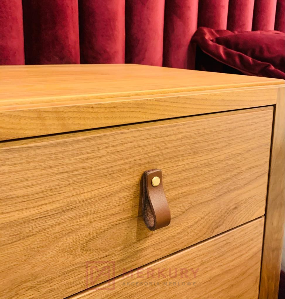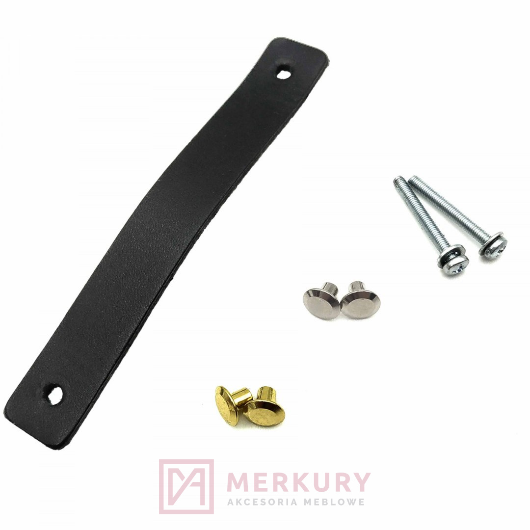 Uchwyt meblowy stworzony w nowoczesnym stylu wpasuje się w najbardziej wymagające gusta. Kształt uchwytu pozwala na wygodny i pewny uchwyt. Uniwersalne zastosowanie - skórzanego paska użyjesz jako uchwyt, jako gałkę lub jako kołatkę. Wysokiej jakości skóra naturalna idealnie podkreśli charakter mebla. W zestawie dodajemy dekory (okucia) złote i srebrne - Ty zdecydujesz jakiego użyjesz.