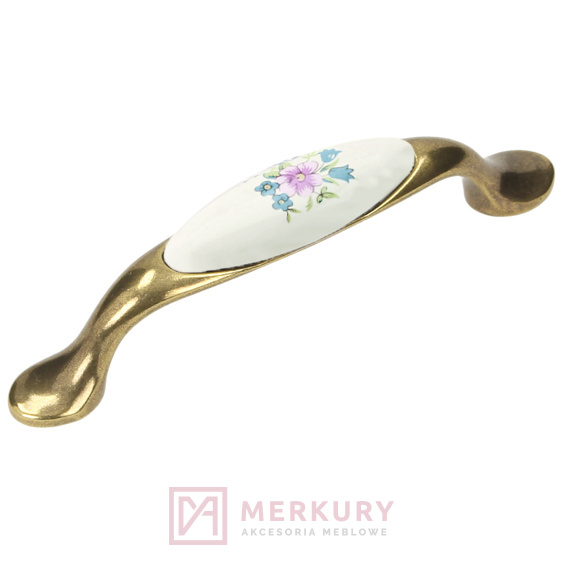Uchwyt porcelanowy UP19, stare złoto, porcelana różowy kwiat z niebieskimi, 96mm