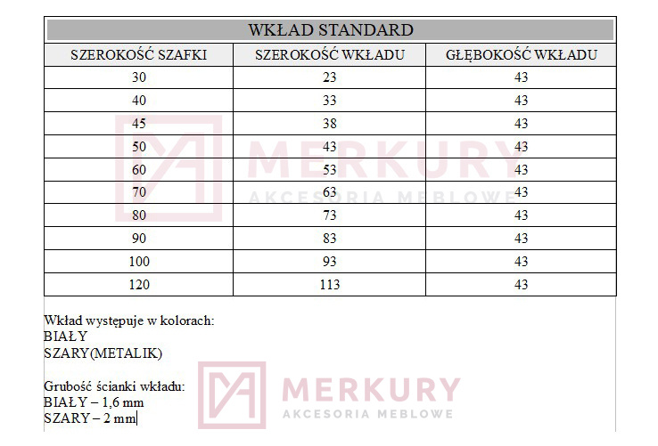 Wkład STANDARD pasuje do większości modeli szuflad oferowanych na polskim rynku. Możesz samodzielnie przyciąć swój wkład do ok. 2,5 cm z każdej strony, by lepiej go wpasować do szuflady. Wykonany jest z tworzywa sztucznego o grubości 1,6mm. Wkład STANDARD pasuje do szuflad: BLUM Tandembox, GTV Modern Box, AMIX System Box itp.