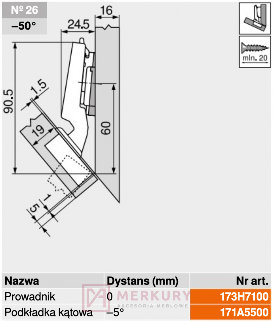 • zawias kątowy -45°