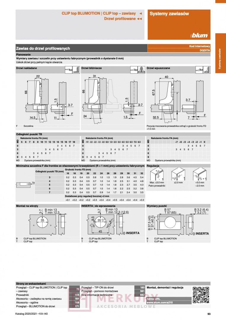 Zawias meblowy nakładany do drzwi profilowanych BLUM 71B9590 BLUMOTION Clip-T 95°